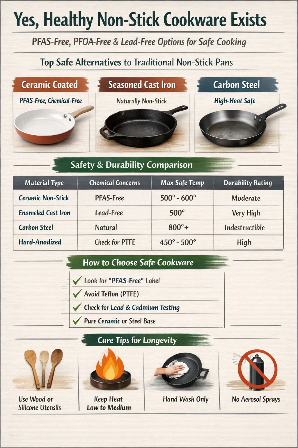 Tá sláintiúil go hiomlán non-stick cookware ar fáil ar an margadh inniu. Cé go raibh pannaí traidisiúnta neamh-bata ag brath ar cheimiceáin mar PFOA agus PTFE (Teflon), úsáideann roghanna sláintiúla nua-aimseartha bratuithe ceirmeacha mianraí-bhunaithe nó próisis nádúrtha seasoning a fhaightear in iarann teilgthe agus cruach carbóin. Chun a chinntiú go bhfuil do chuid earraí cócaireachta sláintiúil, ní mór duit lipéid a lorg a shonraíonn go sainráite go bhfuil an táirge PFAS-free, PFOA-free, and Lead/Cadmium-free . Soláthraíonn na roghanna seo áisiúlacht scaoileadh bia gan riosca astuithe múiche tocsaineach ag teochtaí arda.