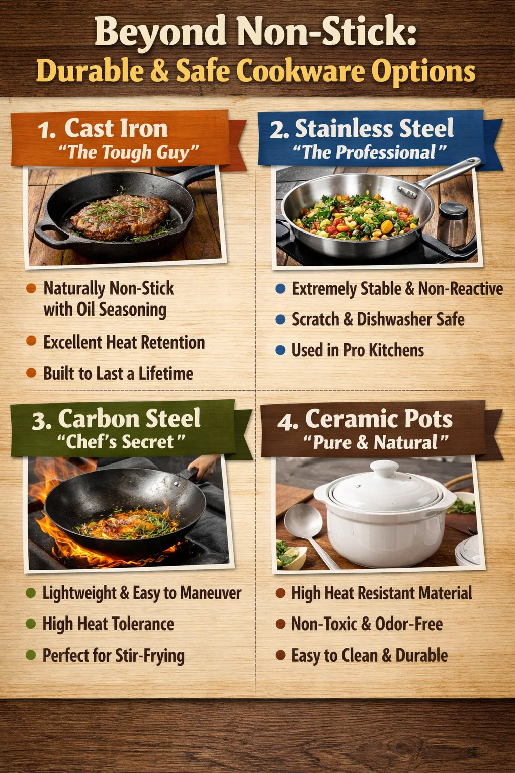 Cé go nua-aimseartha earraí cócaireachta neamh-bata sábháilte faoi ghnáthúsáid, má tá tú ag lorg earraí cócaireachta atá go hiomlán saor ó imní, gan imní faoi scealpadh brataithe nó saincheisteanna ardteochta, go deimhin tá go leor roghanna eile níos láidre agus níos iontaofa ann.