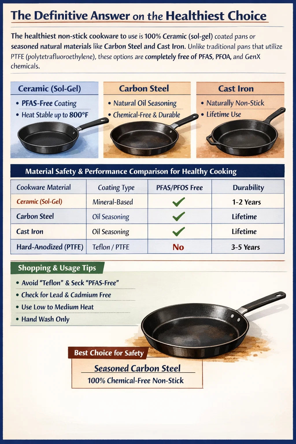 An sláintiúla earraí cócaireachta neamh-bata a úsáid is Pannaí brataithe 100% ceirmeacha (sol-ghlóthach) nó ábhair nádúrtha seasoned cosúil le Cruach Carbóin agus Iarann Teilgthe . Murab ionann agus pannaí traidisiúnta a úsáideann PTFE (polytetrafluoroethylene), tá na roghanna seo go hiomlán saor ó cheimiceáin PFAS, PFOA, agus GenX. Dóibh siúd atá ag lorg an phróifíl iomlán is sábháilte gan riosca ceimiceach nialasach fiú ag teochtaí searing, Cruach Carbóin seasoned Seasann sé amach mar an rogha is fearr mar go gcruthaíonn sé bacainn fisiciúil neamh-bata ag baint úsáide as ach teas agus ola glasraí polaiméirithe.