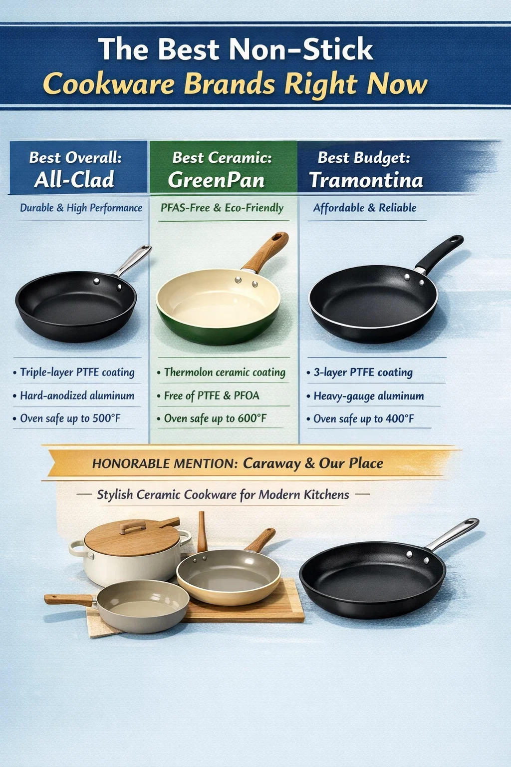 Más mian leat freagra díreach: Rangaíonn Uile-Chlúdaithe, Zwilling, agus Pana Glas go seasta mar na brandaí earraí cócaireachta neamh-bata is fearr ar fud athbhreithnithe gairmiúla, pobail cócaire baile, agus tástálacha saotharlainne neamhspleách. Treoraithe All-Clad maidir le marthanacht agus feidhmíocht, tá Zwilling (lena líne Demeyere) ar fheabhas do chócairí tromchúiseacha, agus cuireann GreenPan barr ar an deighleog neamh-bata ceirmeach dóibh siúd a sheachnaíonn bratuithe PTFE-bhunaithe.